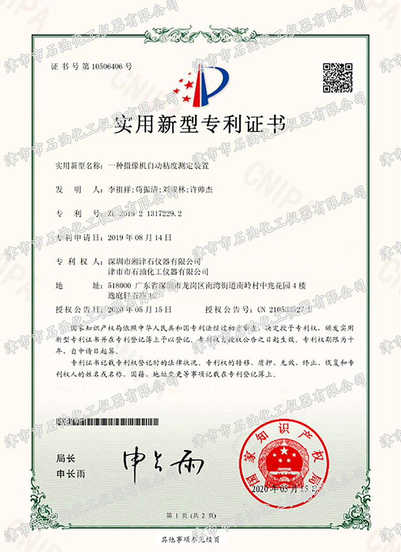 实用新型专利证书-自动含聚合物油剪切安定性测定器